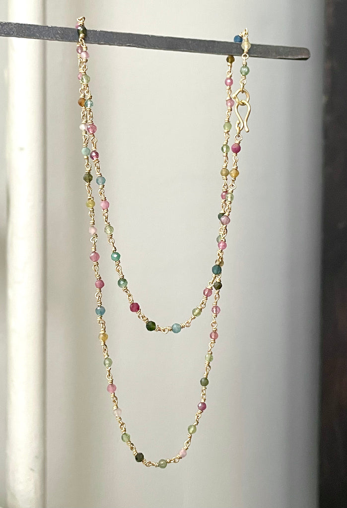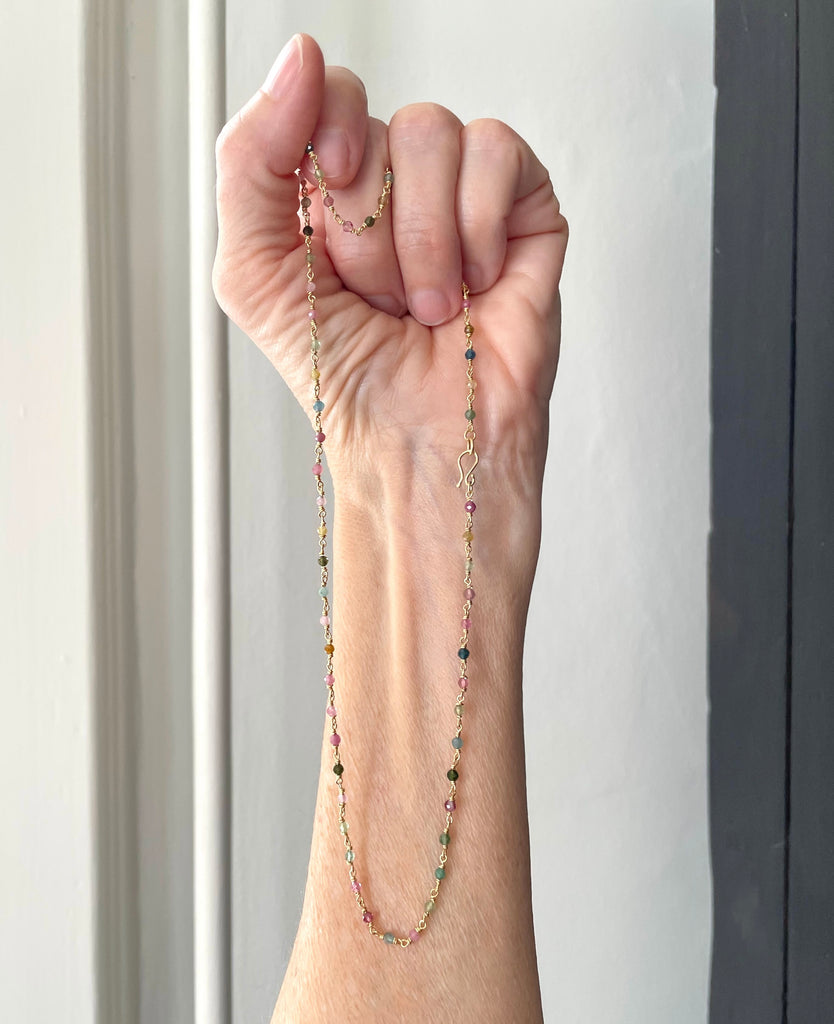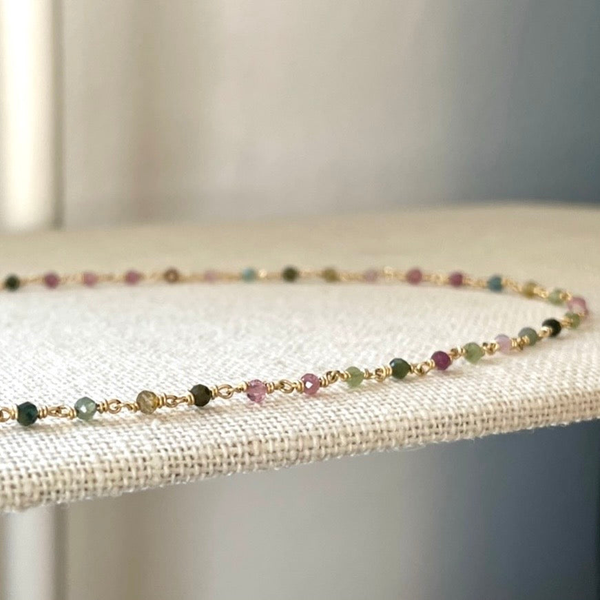 Tiny but mighty 2.5mm precisely faceted tourmaline beads, hand woven into 18k wire. Flashes of velvety pinks, blues, greens and olives catching the light.